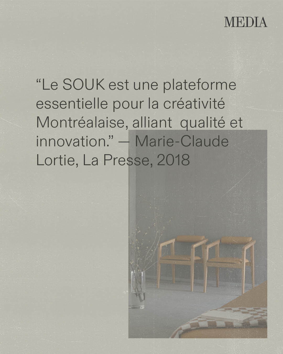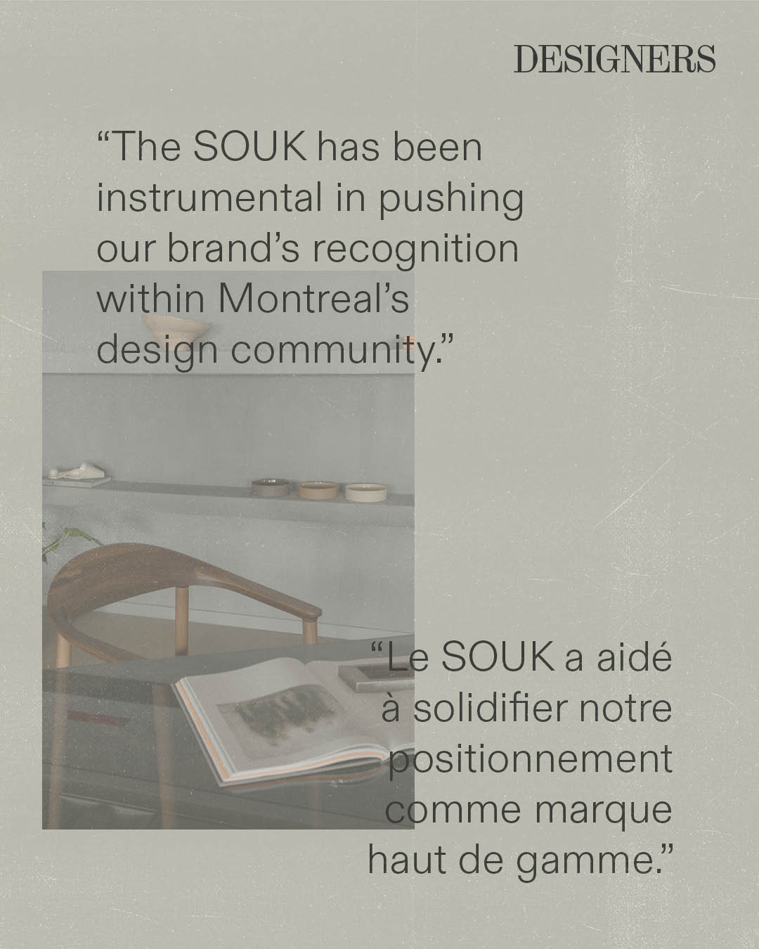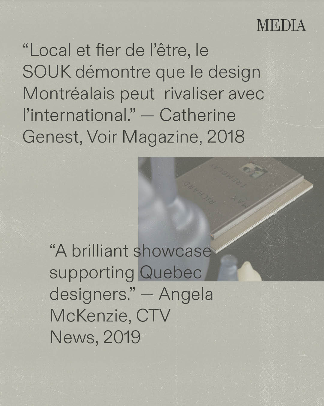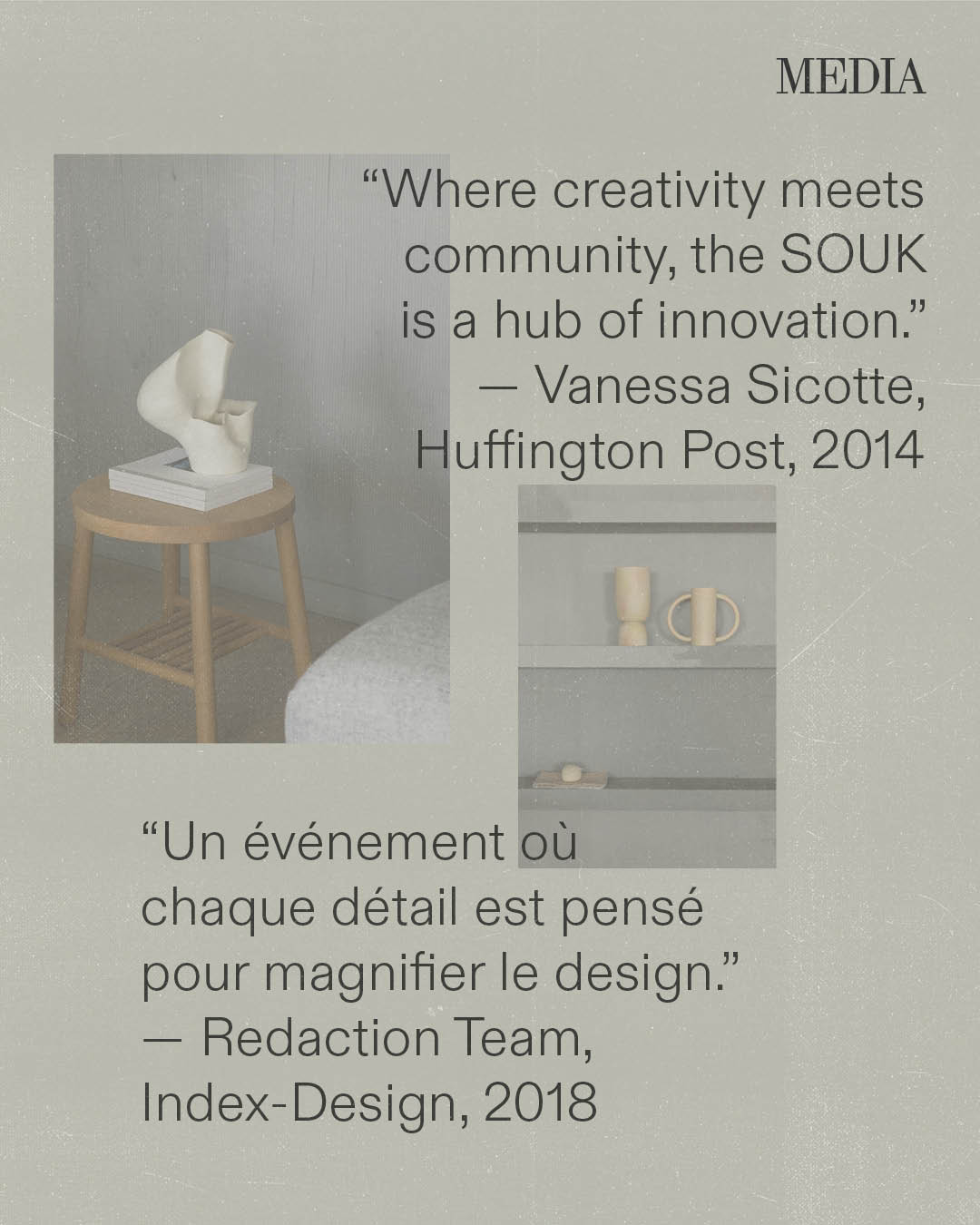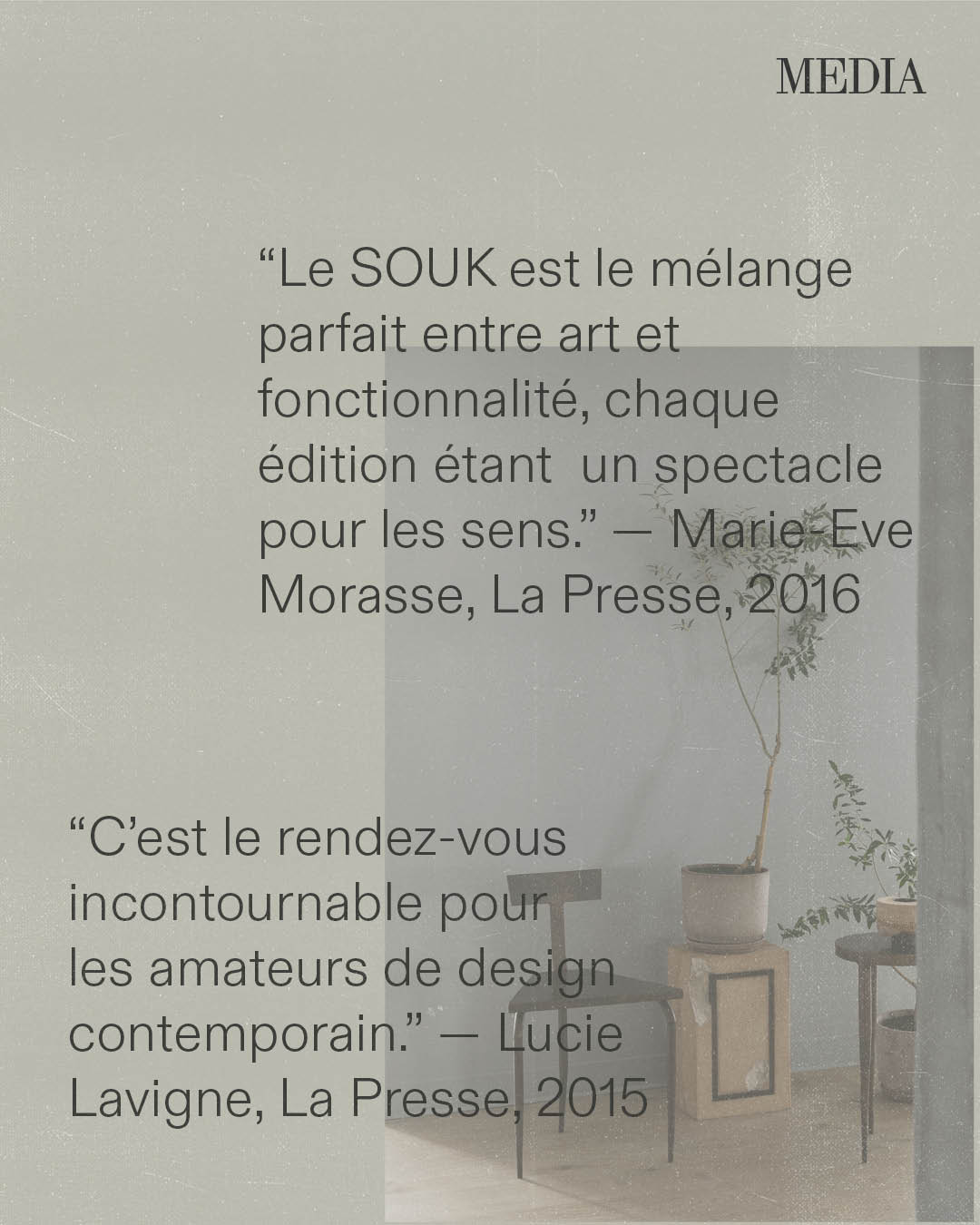 Au fil des ans, les journalistes ont décrit le SOUK comme un « pèlerinage du design », « une lettre d’amour à Montréal » ou « un espace où la créativité redevient humaine ». Pour les designers, il représente l’endroit où leur parcours a commencé ou celui qui leur a donné la confiance de persévérer.