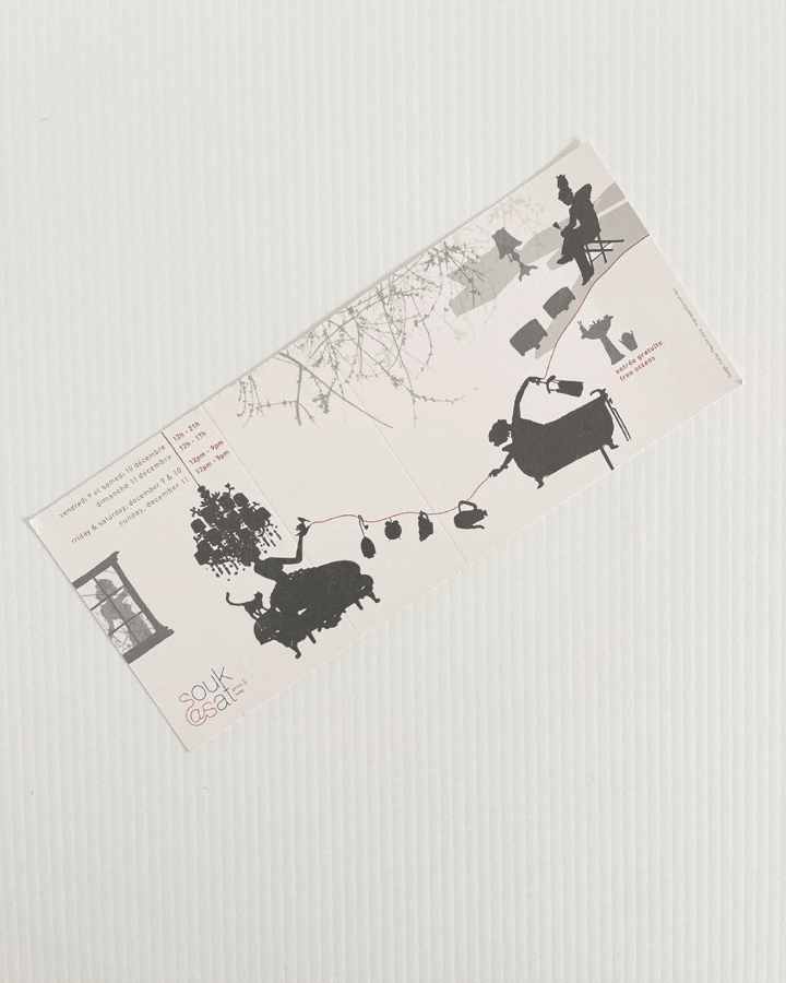 Parmi les créations les plus emblématiques, le flyer de la cinquième édition du SOUK en 2007 se distingue. Il résulte d’une collaboration entre Jacinthe Pilote, fidèle collaboratrice, et Alice Ricciardi, alors une jeune créative de dix ans découvrant sa voix artistique. Des années plus tard, Alice reviendra au SOUK à l’âge adulte pour rejoindre l’équipe créative sur plusieurs projets. Son parcours reflète l’esprit du SOUK : un espace où la créativité, la curiosité et la sensibilité sont encouragées dès le plus jeune âge, cultivant une appréciation durable pour le design local.