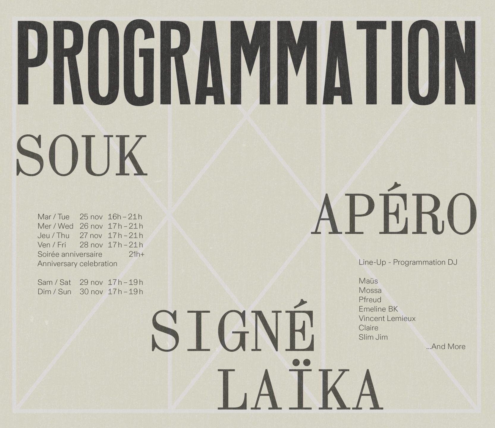 Raviver l’esprit du Laïka au SOUK #20 n’est pas un exercice de nostalgie, c’est reconnaître que certains lieux continuent d’exister à travers nous. Au SOUK APÉRO, signé Laïka, dans cet espace où l’on porte un toast à la créativité et sommes témoins des rencontres spontanées entre visiteurs et designers, ce même pouls reviendra.